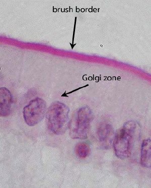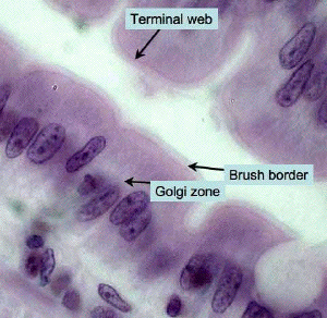 The surface of the simple columnar cells is covered with microvilli. The brush borders of these cells are distinctly "P.A.S. positive" (red staining). Why? The actin filament cores of the microvilli extend down into the apical cytoplasm of the cell where they are crosslinked by myosin and other actin- associated proteins. This dense meshwork of filaments is the terminal web which can be see as the densely eosinophilic line immediately beneath the microvilli.