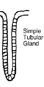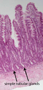 Examples of simple tubular glands may be seen in this section of the small intestine. Locate longitudinal and cross sections of some of these glands (located subjacent to villi). Most of the cells lining each simple gland are goblet cells.