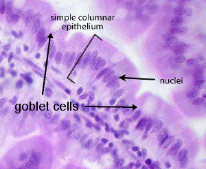 Now observe the luminal surface. This consists of simple columnar epithelium with goblet cells. The goblet cells are examples of unicellular (single cell) glands.