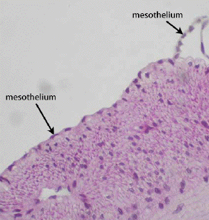Slide DMS037. Look at this slide of the G.I. tract [small intestine, hamster; P.A.S. + H] with high magnification. Observe the abluminal (non-villous) surface and note a delicate, thin layer of simple squamous epithelial cells (may be artefactually missing in some places). Generally, only the flattened nuclei of this layer will be seen; the cytoplasm is too attenuated to be seen in section. This layer of simple squamous epithelium is part of the visceral peritoneum (mesothelium) that covers the surface of many of the organs within the peritoneal cavity.